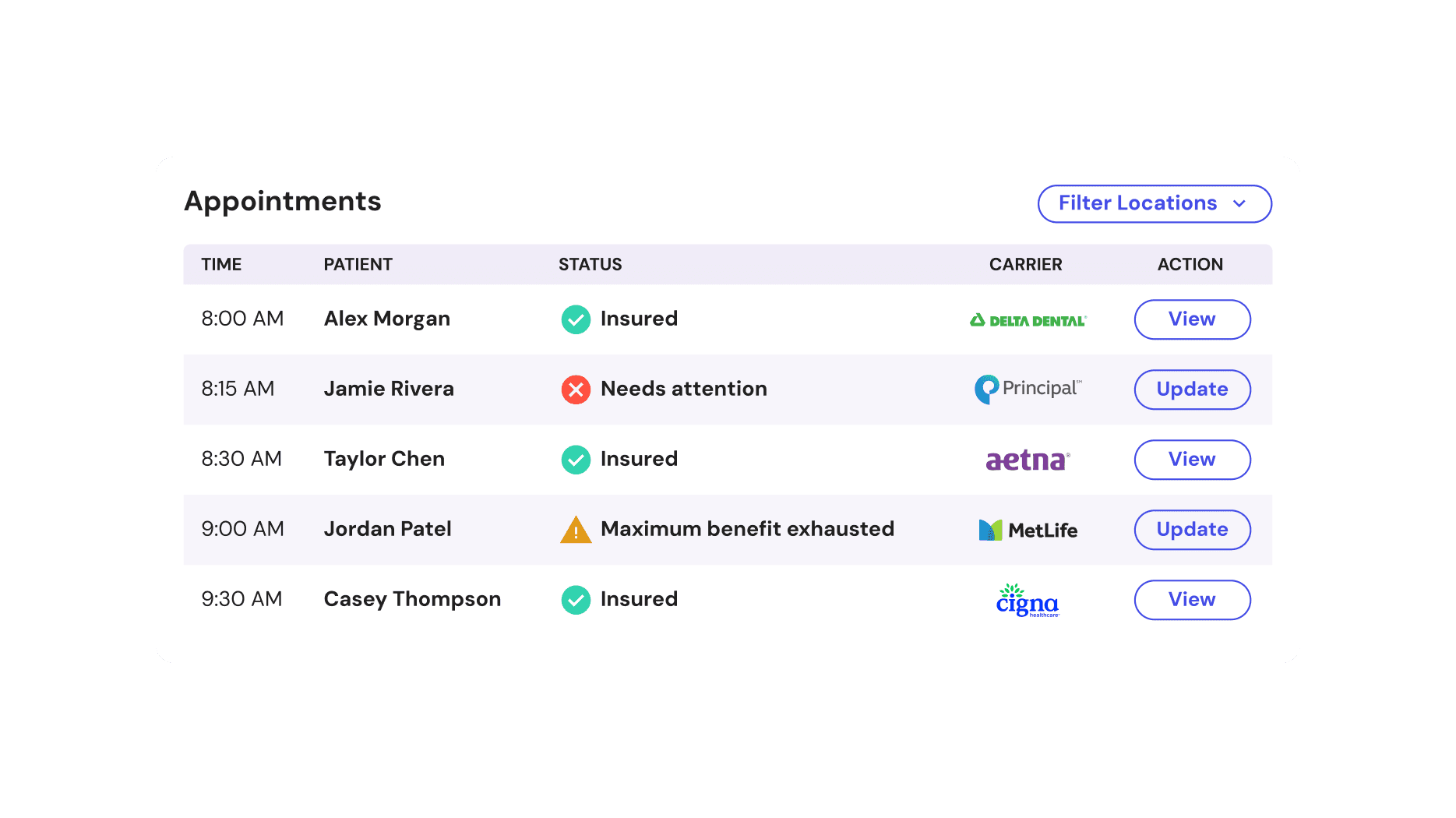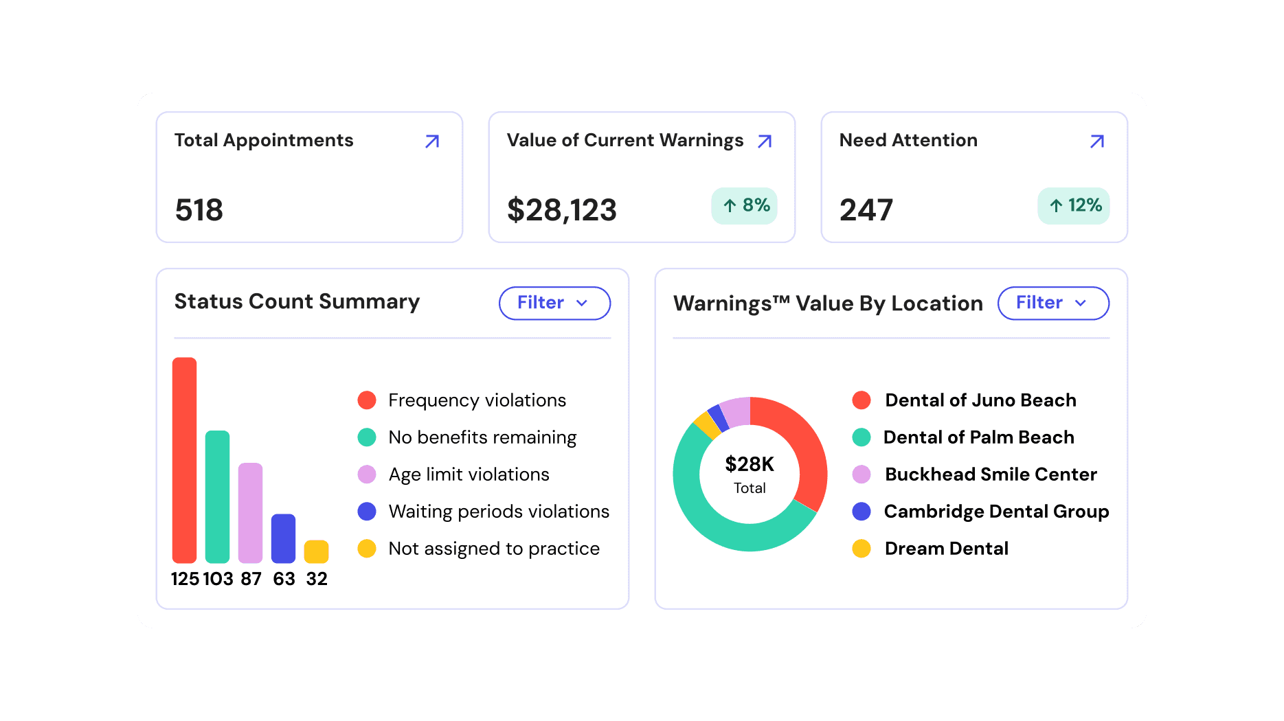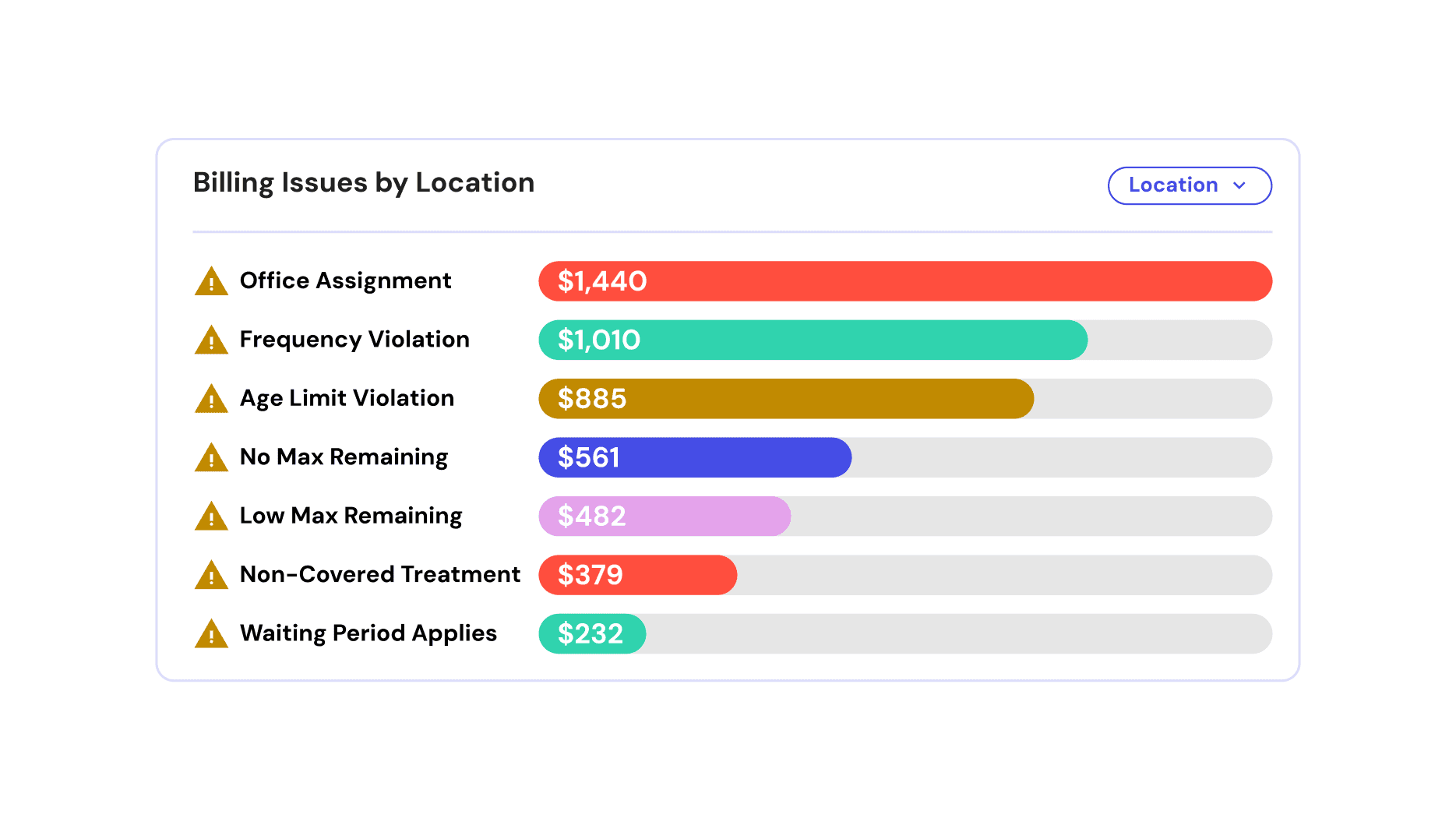 Track insurance warnings, financial risk, and outcomes across every location in one place. Filter by payer, plan, or office, to understand where issues are coming from and how they impact revenue.